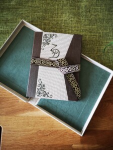 - Design auf dem Cover mit Acrylfarben, Buntstiften, Embossing, Pyrography (brennen), Blattemetallverarbeitung.