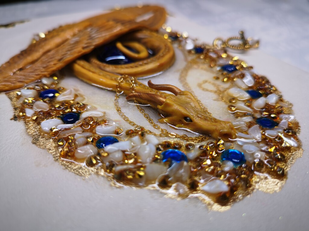 - Veredelung mit 3D-Figuren aus Polymere Clay, flachen Halbedelsteinen, Schmuckstücken, Epoxidharz und Epoxid-Accessoires, Leuchtpulver und -farben.