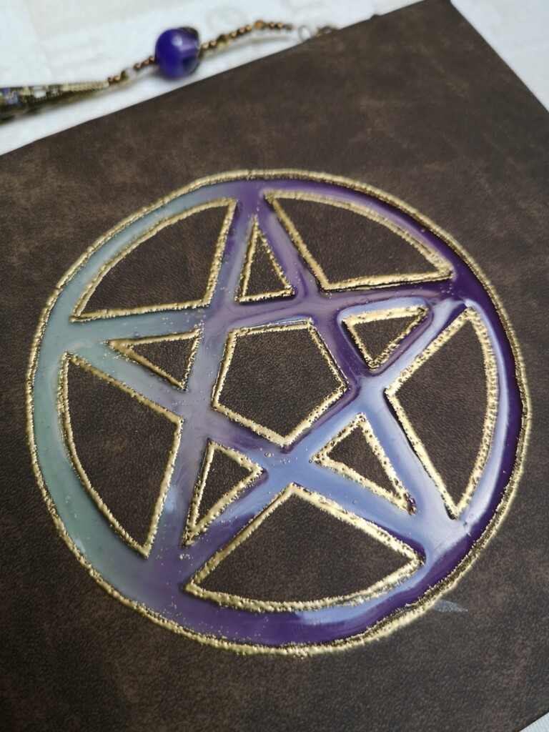 Das Cover sollte natürlich auch magisch sein. Und mit meinen neuen Ideen und Erfahrungen zum Epoxidharz in Verbindung mit meinem Fable für Leuchtfarbe wurde es für mein eigenes natürlich ein leuchtendes Pentagram. Das zweite gestaltete ich etwas einfacher, die Rundungen auszuschneiden war doch sehr strapazierend für meine Finger. Durch eine nicht ganz waagerechte Lagerung bei der ersten Schicht Harz entstand der Farbverlauf im Pentagram. Durch Zufälle entstehen manchmal doch sehr interessante Effekte, immer ein Grund füch mich zu experimentieren und nicht über alles die Kontrolle haben zu wollen 😉