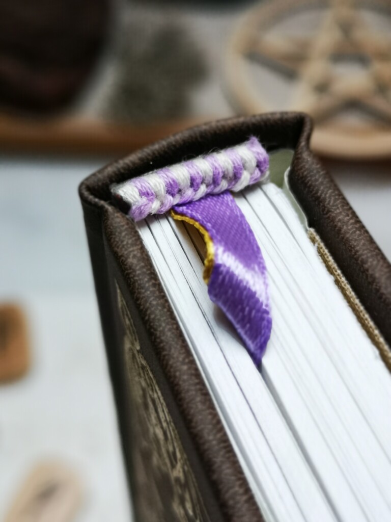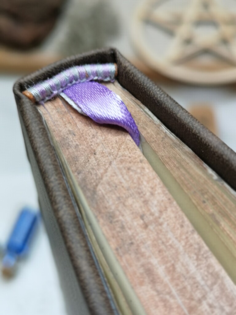 Das Cover sah noch etwas nackt aus, also experimentierte ich mit zusätzlichem Embossing herum. Ich wählte alle weiteren Komponenten des Buches aus, als Vorsatzpapier ein handmarmoriertes Papier in violett, zwei Lesezeichen und Kapitalbändchen jeweils farblich passend. Die Schnittkanten des Buchblocks färbte ich auch noch ein um ihn älter aussehen zu lassen.