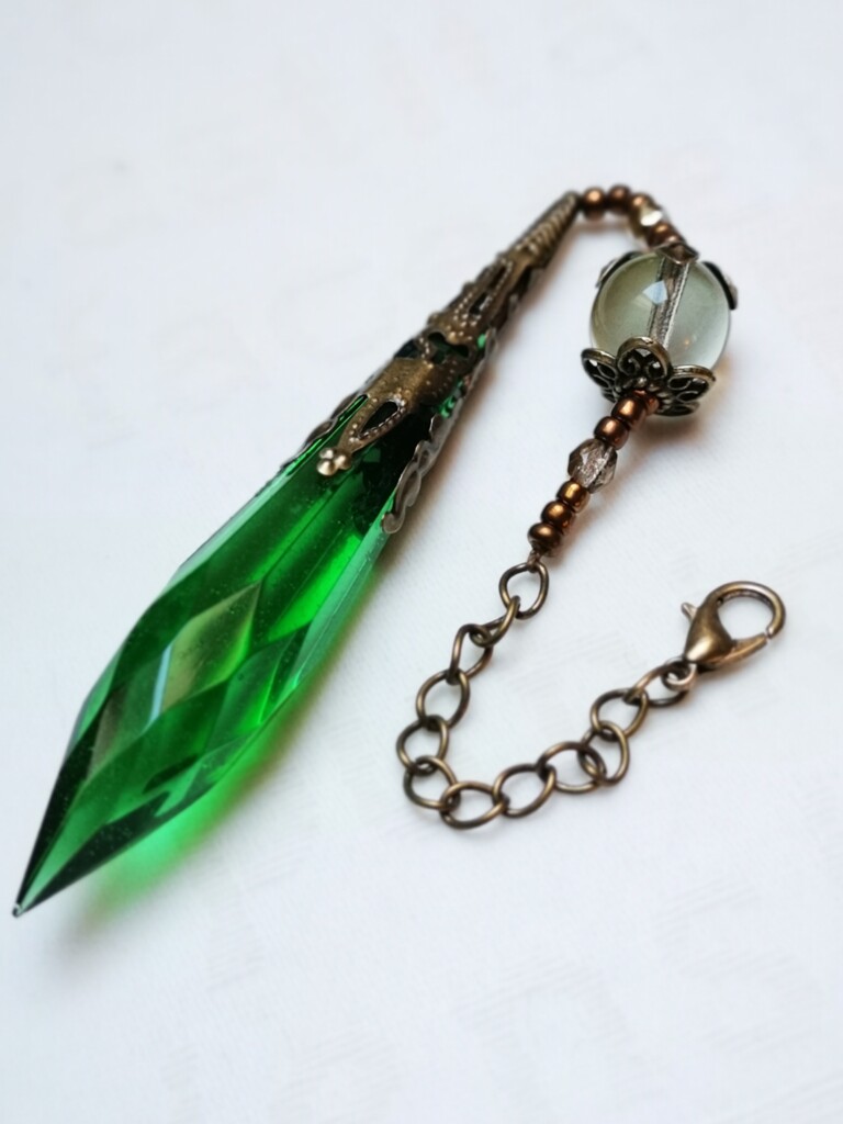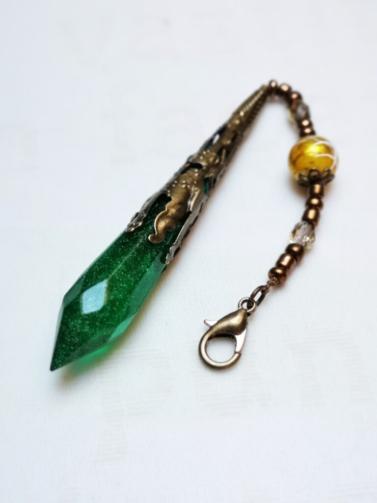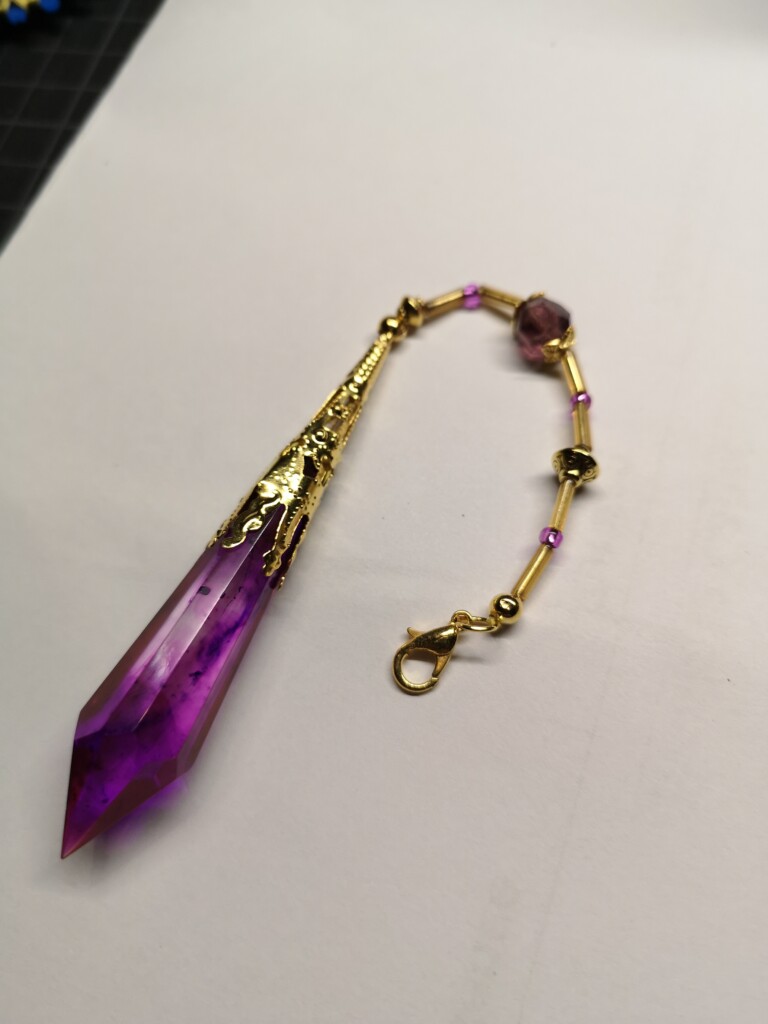 In letzter Zeit hatte ich auch viel mit Kristallen aus Epoxid experimentiert und wollte diese endlich sinnvoll an einem Buch verwenden. So kam ich auf die Idee, dass ein Anhänger am Buchrücken sich super machen würde. Aber so, dass man ihn bei Bedarf auch abmachen kann. Die Kristalle mussten noch geschliffen und poliert werden, keine einfache Aufgabe. Ich musste noch sehr viel feinkörnigere Schleifpapiere und eine Schleifpaste bestellen, bevor ich die Kristalle fertig machen konnte. Die Arbeit hat sich gelohnt, die Ergebnisse können sich sehen lassen!