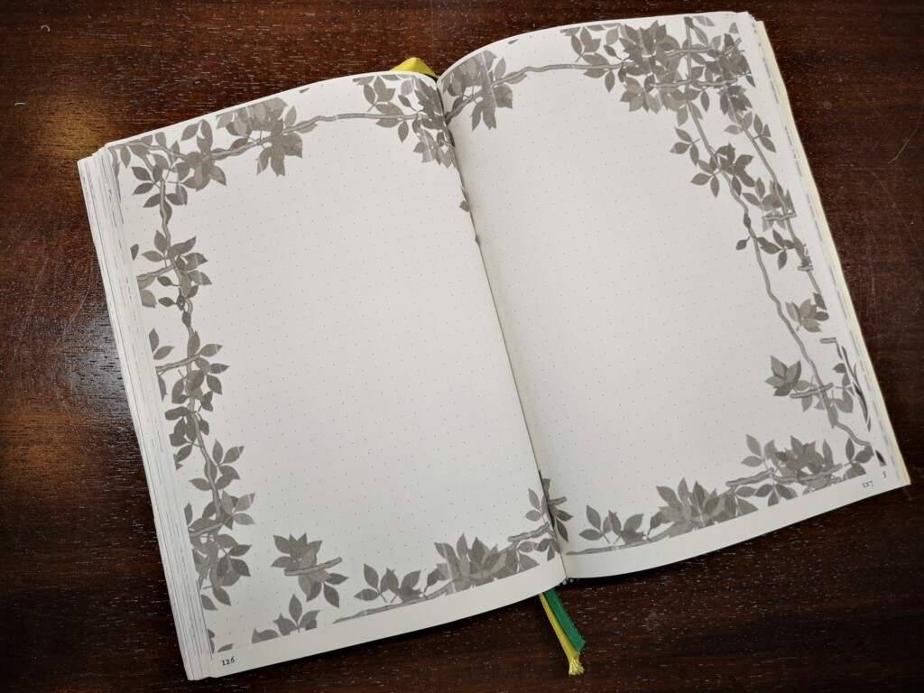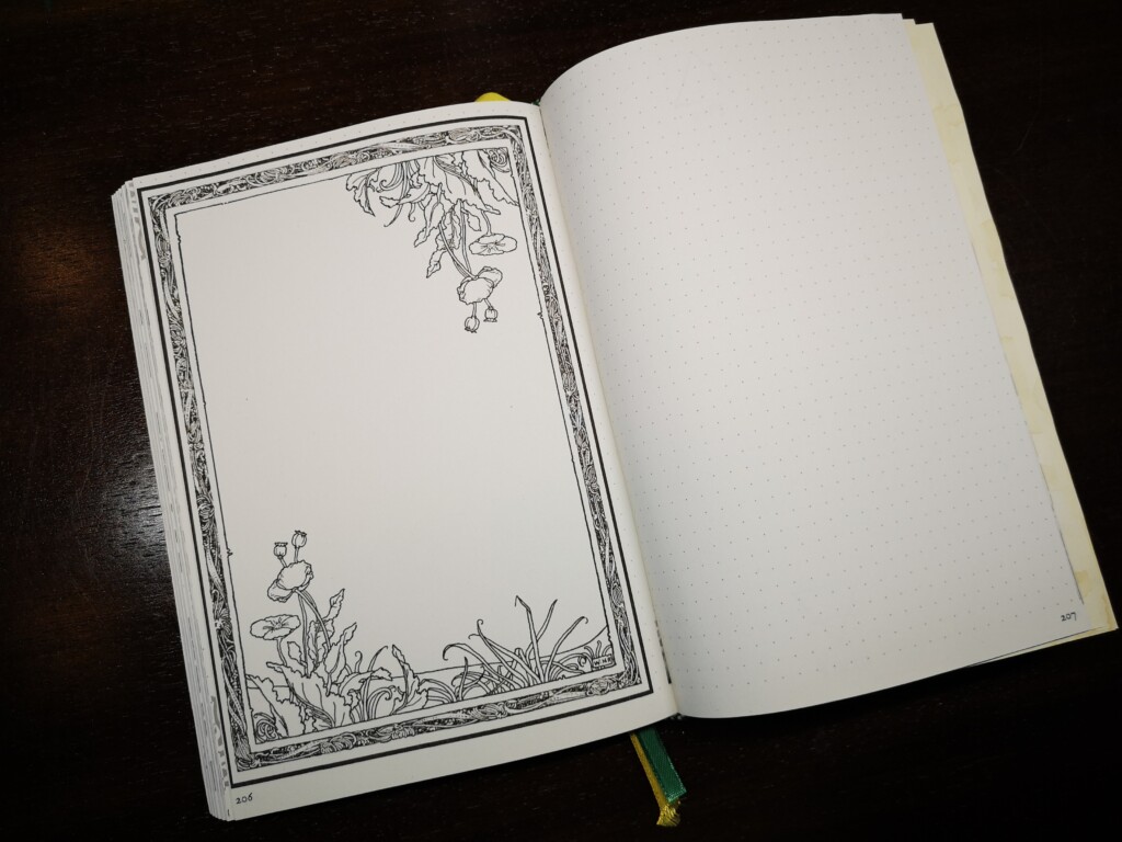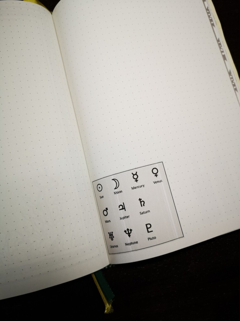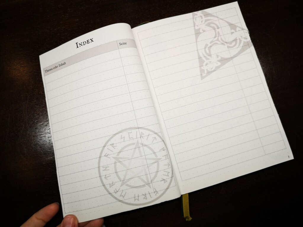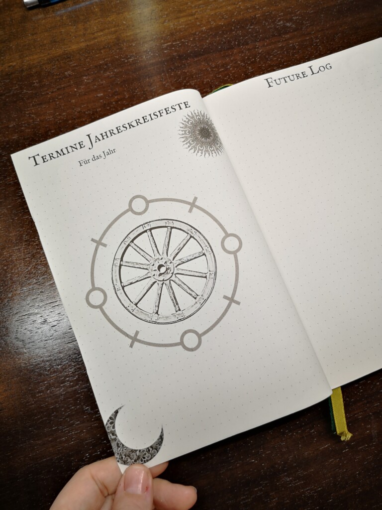 Also an den PC gesetzt und eine Datei erstellt mit Punktierung. Tja, und dann sind da die Seitenzahlen, dürfen natürlich nicht fehlen. Eines kam zum Anderen und ich hatte am Ende eine 20 MB große Datei voll mit schönen magischen Grafiken, naturalen Bildern und mystischen Symbolen. Auch dabei ist ein Index, Future Log und dazu ein Jahresrad zum Selbst-Beschriften mit den aktuellen Terminen.