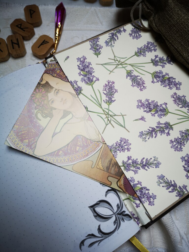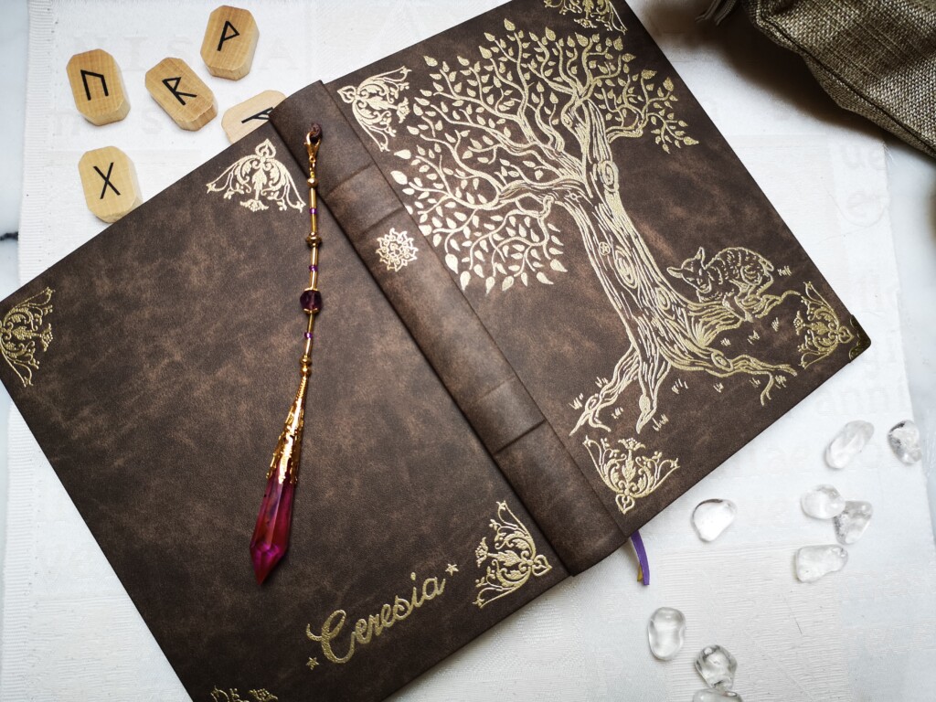 Eine Freundin stellte direkt ein Witchy-BuJo in Auftrag, so begann ich ein drittes obwohl das zweite noch nicht einmal fertig war. Sie wollte auf dem Cover aber ein Bild von einem Baum und ihrem Krafttier anstatt dem Epoxid-Inlay, außerdem keine gealterten Seiten. Wir suchten ihr Eckverzierungen heraus, fügten noch eine Tasche hinten ein, da sie gerne kleine Zettel aufhebt und ich gestaltete einen Anhänger aus dem Kristall, den sie sich ausgesucht hatte. So wurde dann dieses wundervolle Witchy-BuJo geboren.