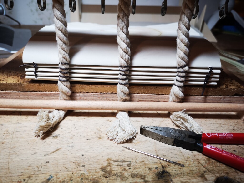 Die Fadenheftung ist eine traditionelle Methode, um die Seiten eines Buches miteinander zu verbinden. Dabei werden die einzelnen Buchseiten in kleine Abschnitte gefaltet und dann mit einem starken Faden oder einer Schnur miteinander vernäht. Diese Nähte werden dann über sogenannte Bünde genäht die das Buch im Einband halten oder direkt durch den Buchrücken gezogen, was eine feste Verbindung zwischen den Seiten und dem Einband des Buches gewährleistet. Buchblock und Einband werden seperat voneinander hergestellt und erst im letzten Schritt miteinander verbunden.