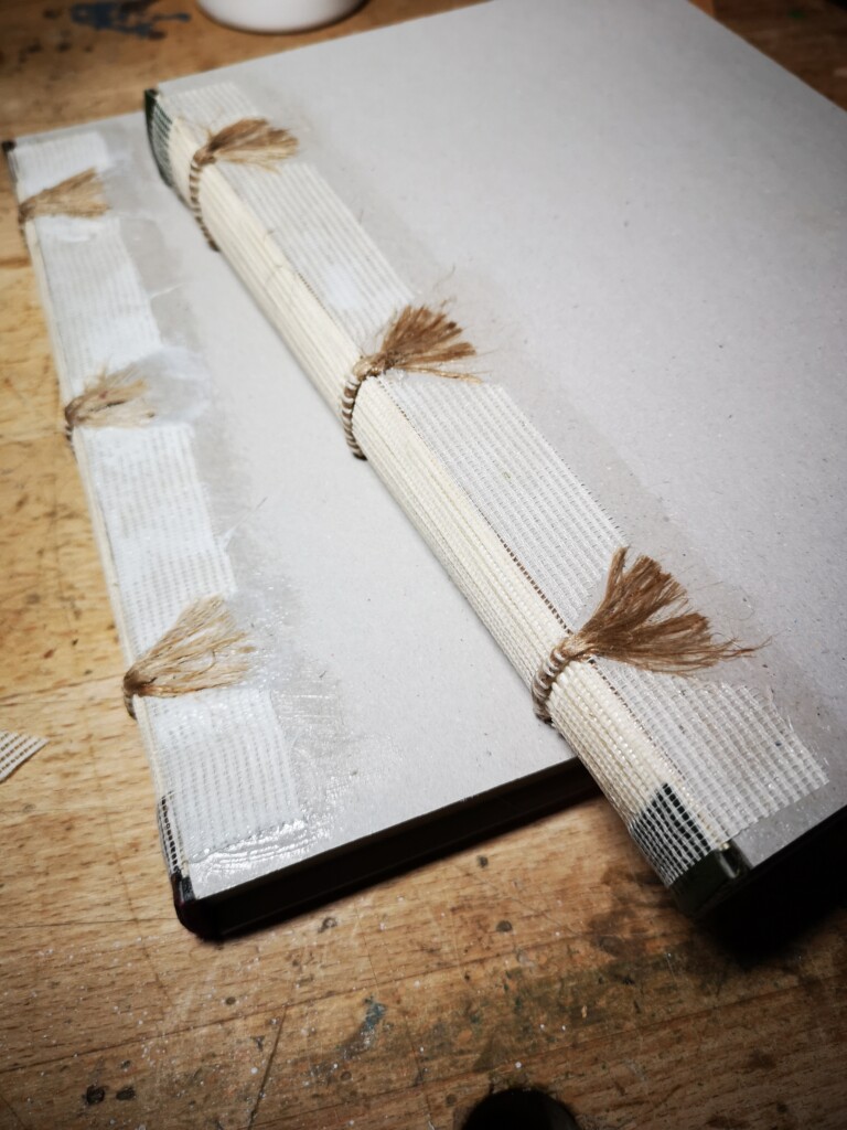 - Auf der Innenseite der Buchdeckel sieht man die Abdrücke der Bänder und des Einbandmaterials etwas durch.