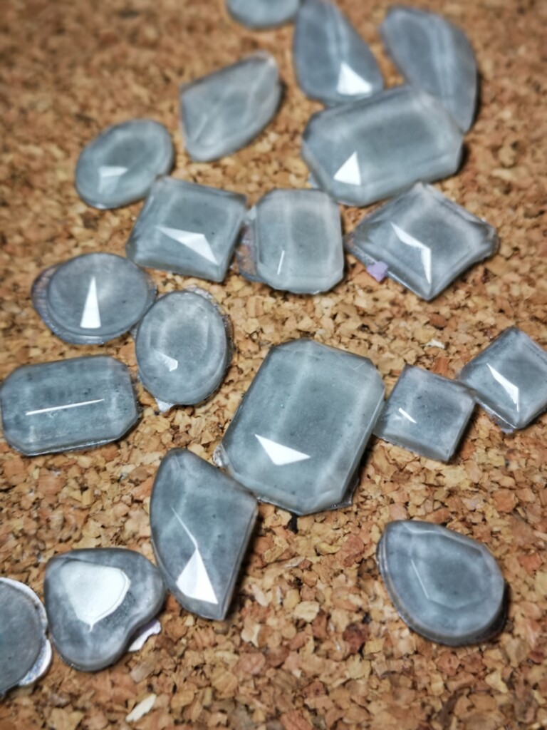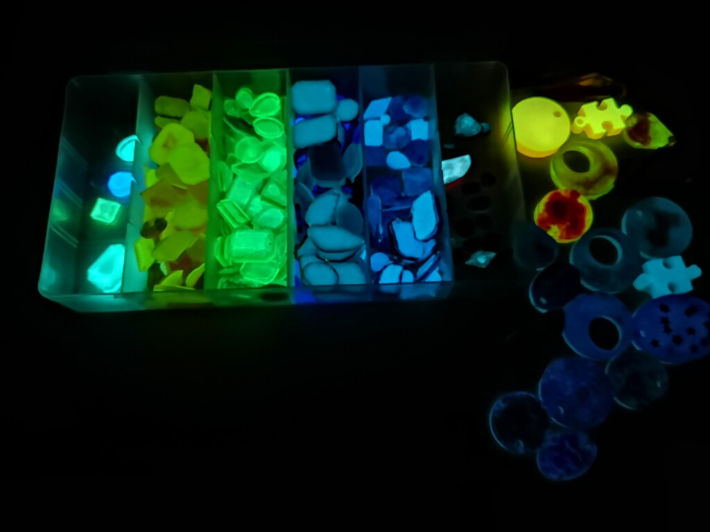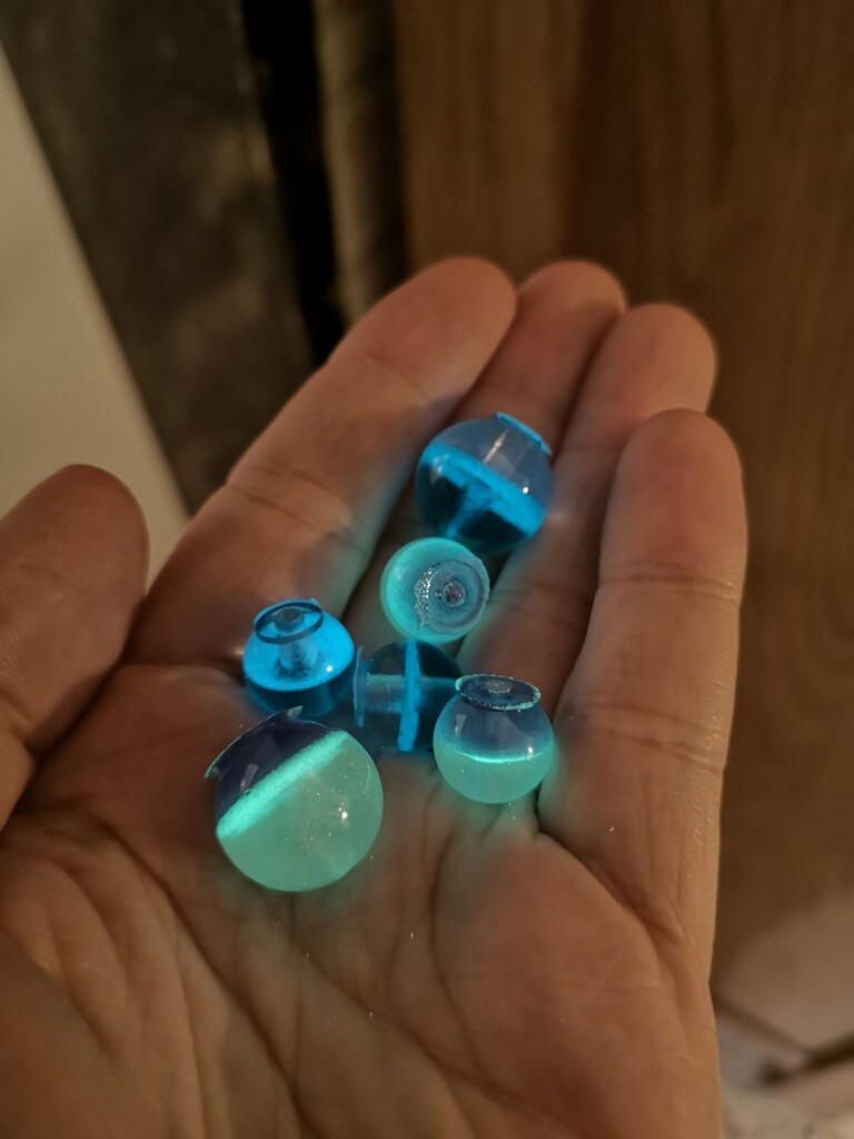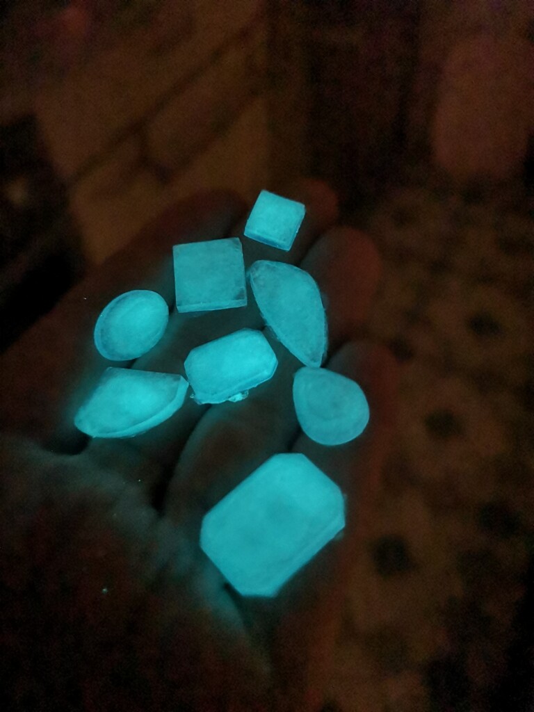 Diese kleinen, selbstgegossenen Steine verwende ich auf Buchcovern, Anhängern oder als dekorative Elemente für besondere Projekte. Momentan produziere ich keine neuen Kristalle – meine Vorräte sind gut gefüllt – doch hier kannst du einen Blick auf die rohen Steinchen werfen und sehen, wie sie im Dunkeln zu leuchten beginnen.