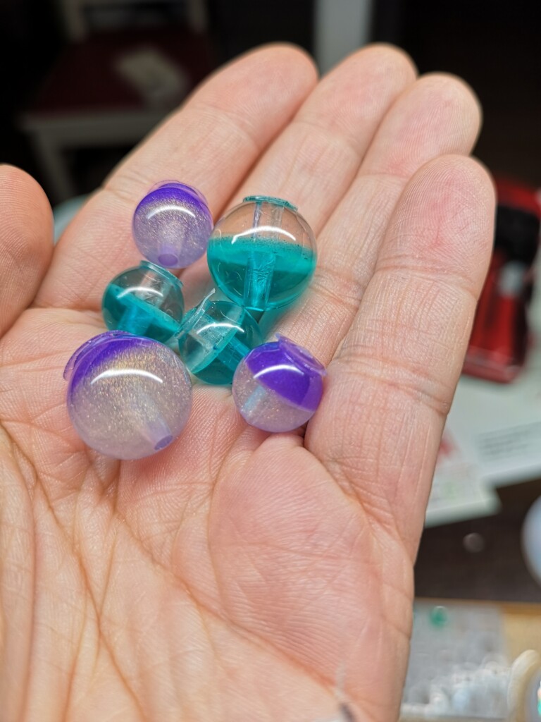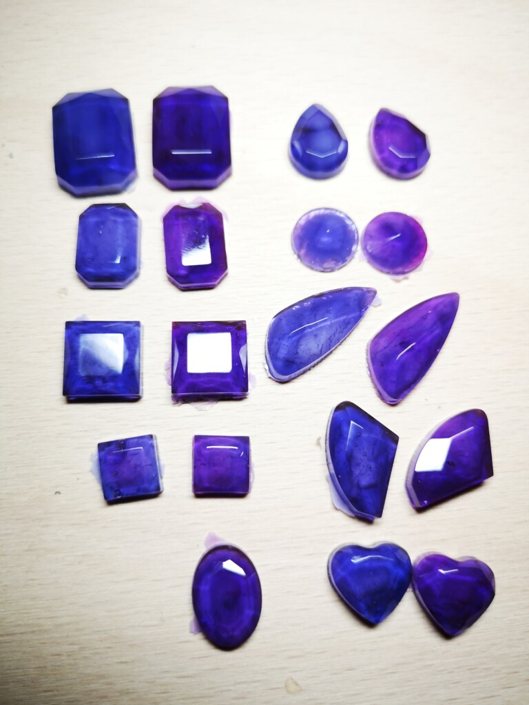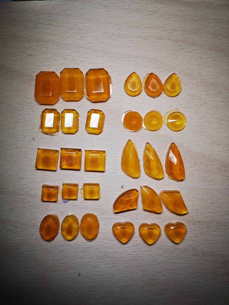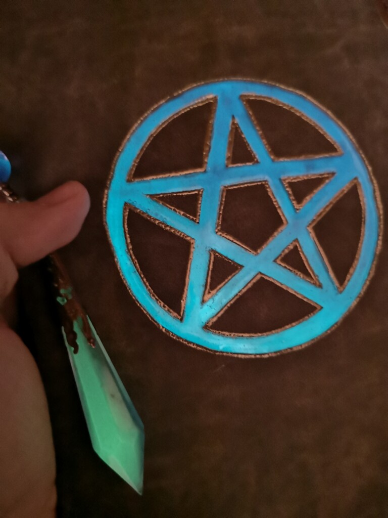 Diese kleinen, selbstgegossenen Steine verwende ich auf Buchcovern, Anhängern oder als dekorative Elemente für besondere Projekte. Momentan produziere ich keine neuen Kristalle – meine Vorräte sind gut gefüllt – doch hier kannst du einen Blick auf die rohen Steinchen werfen und sehen, wie sie im Dunkeln zu leuchten beginnen.