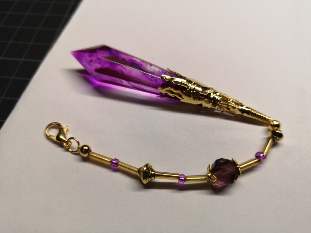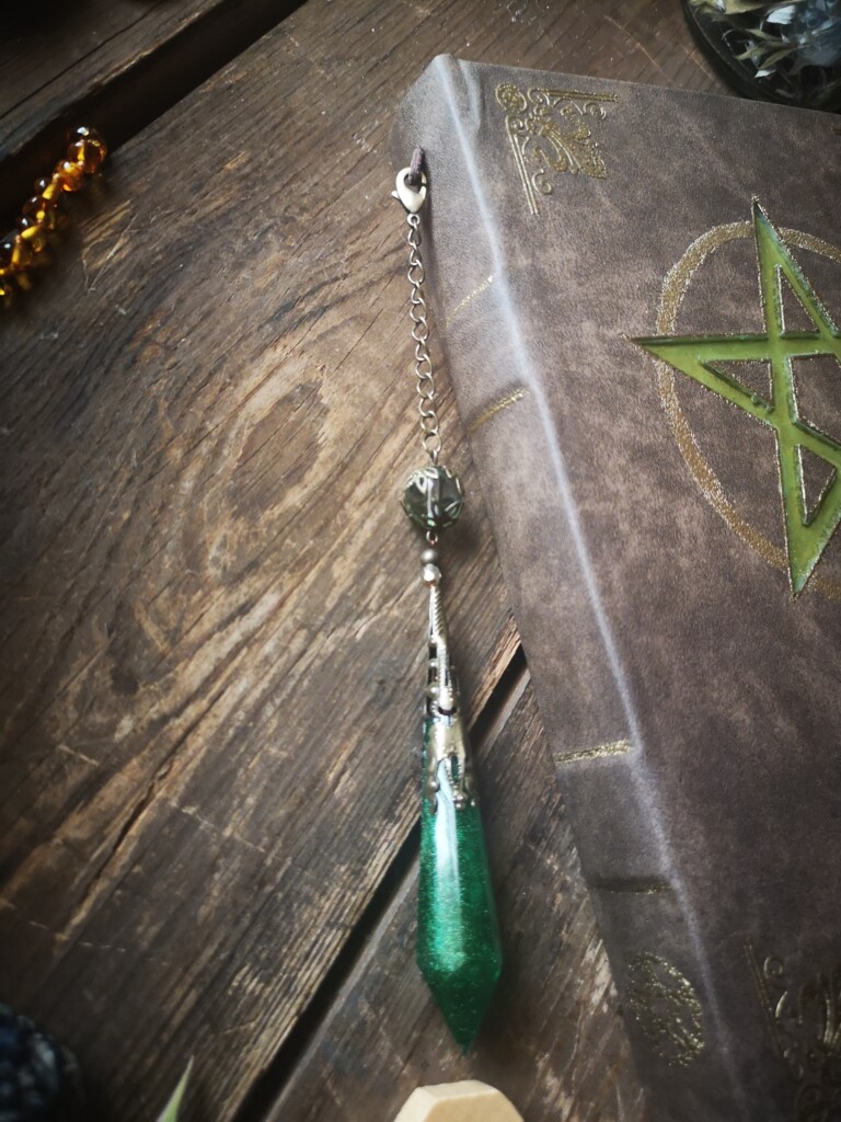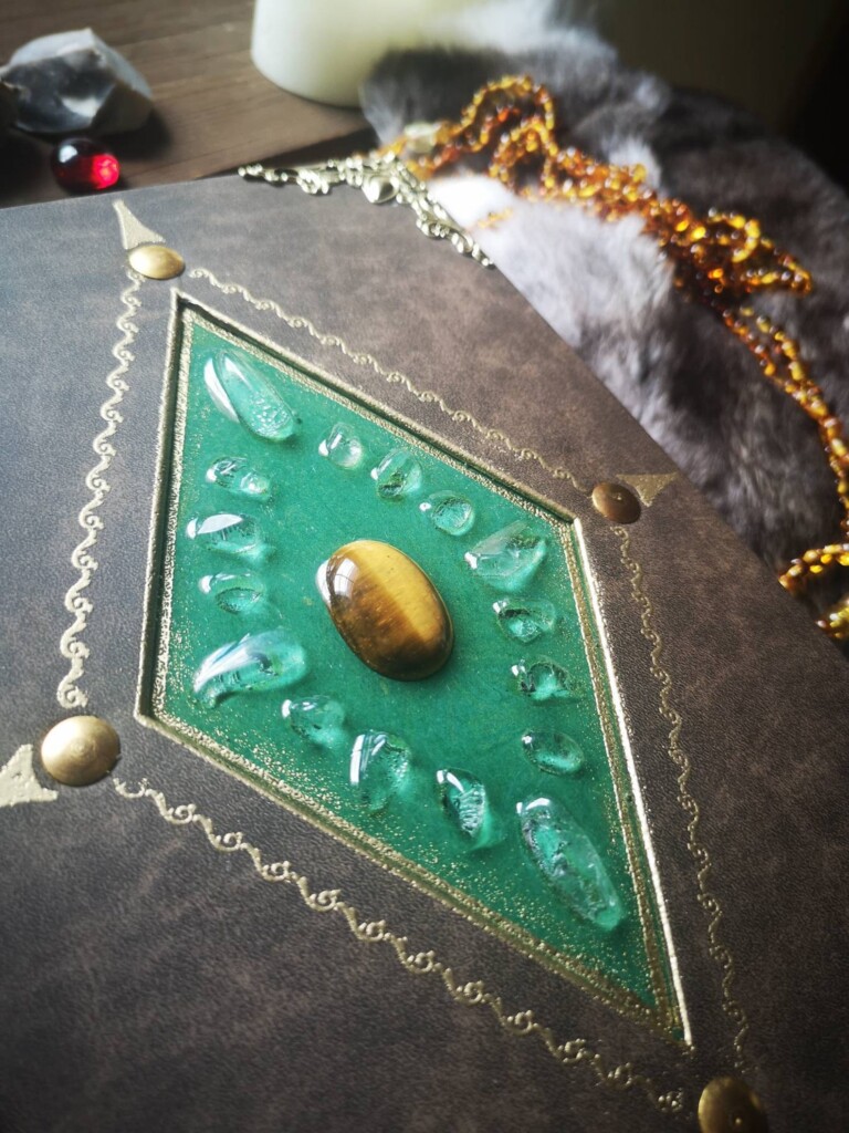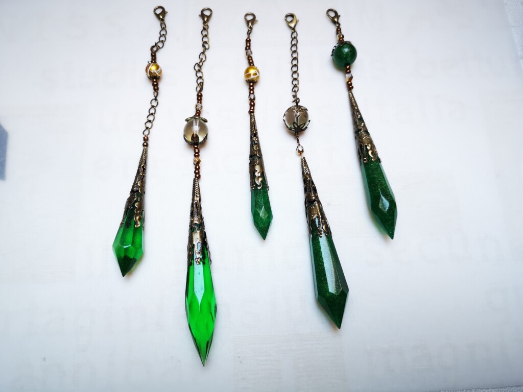 Einige meiner Journale – und alle „Magic Books“ – besitzen eine Schlaufe, in die diese Schmuckstücke eingehängt werden können. Manche Kristalle sind aus Epoxidharz gegossen, andere aus echten Halbedelsteinen gefertigt oder kombiniert.