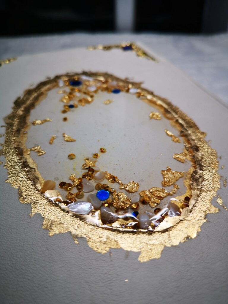 Ich nutze das Harz nicht, um ganze Flächen zu versiegeln, sondern gezielt für Akzente: um leuchtende Muster auszugießen, kleine Steine oder Glasfragmente einzubetten oder farbige Effekte zu schaffen, die mit Licht und Tiefe spielen.