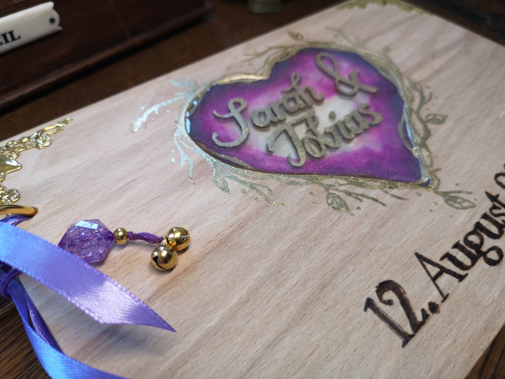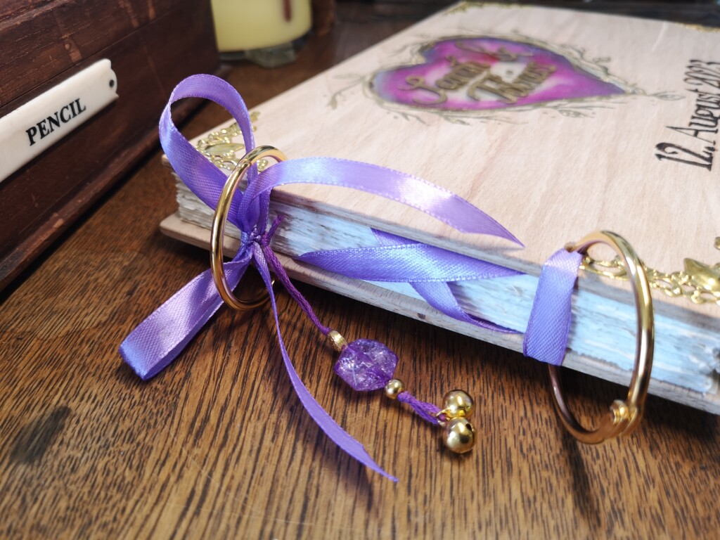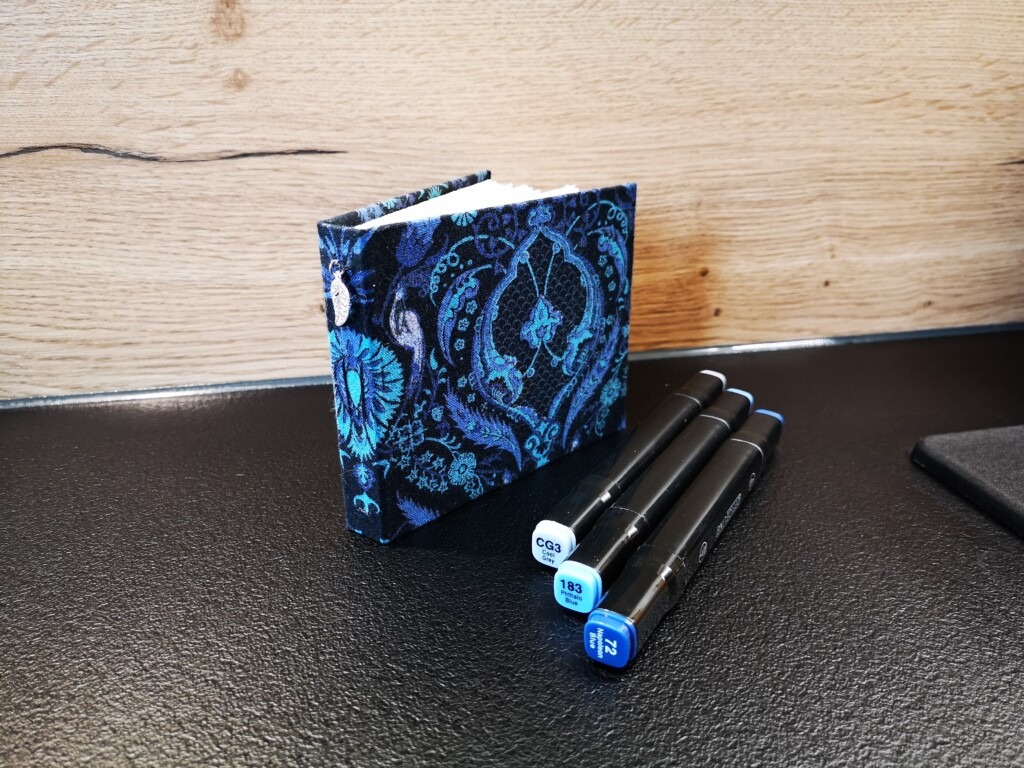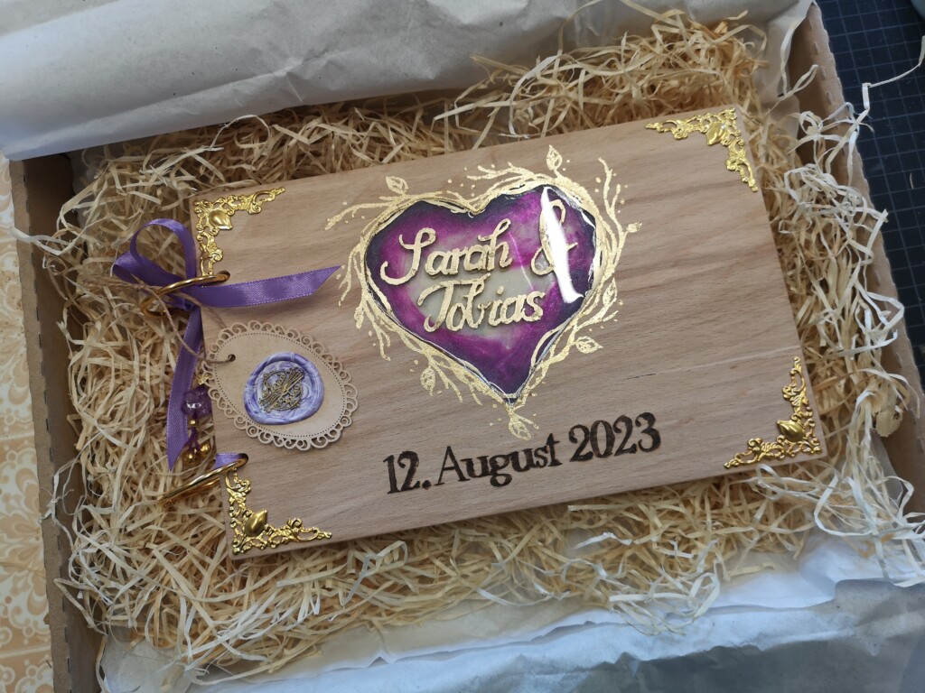 Wir kommunizierten über WhatsApp, wo ich ihr verschiedene Materialien und Skizzen vorstellte. Die Notizen band ich mit einer Leimbindung, verstärkt mit Leinengarn, um ihre Haltbarkeit zu erhöhen. Das Cover-Design gestaltete ich von Hand mit Buntstiften und verlieh ihm mit einem Hauch von Gold eine besondere Note. Auf der Box erstrahlten die Initialen in elegantem Glanz, geprägt mit Embossing-Powder.