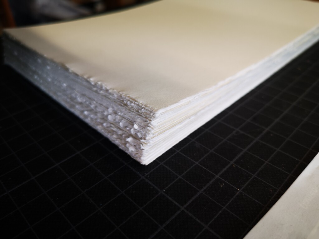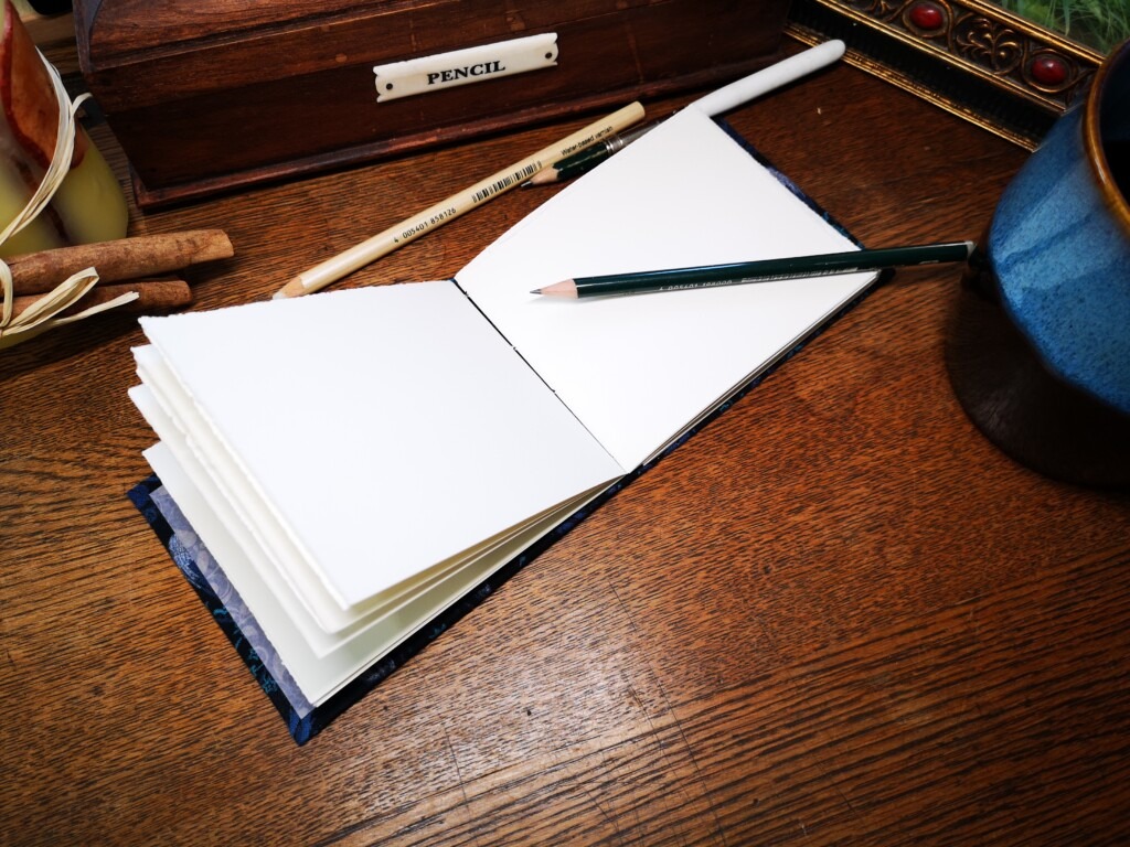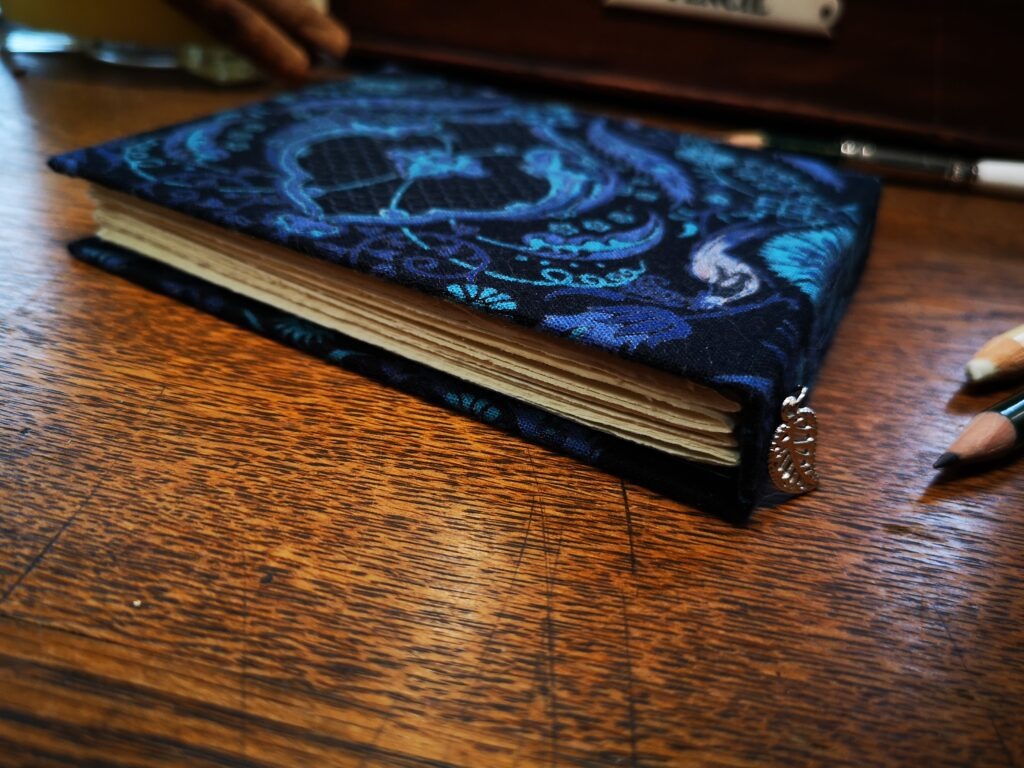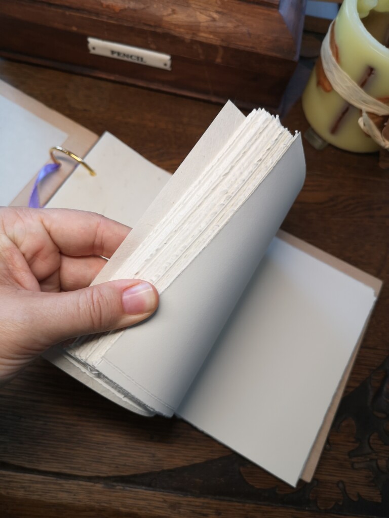 Wir kommunizierten über WhatsApp, wo ich ihr verschiedene Materialien und Skizzen vorstellte. Die Notizen band ich mit einer Leimbindung, verstärkt mit Leinengarn, um ihre Haltbarkeit zu erhöhen. Das Cover-Design gestaltete ich von Hand mit Buntstiften und verlieh ihm mit einem Hauch von Gold eine besondere Note. Auf der Box erstrahlten die Initialen in elegantem Glanz, geprägt mit Embossing-Powder.