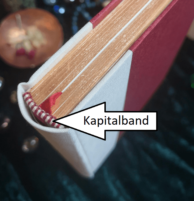 Das Kapitalband – oder auch Kaptalband – hat etwas mit dem Buchrücken und dem Buchblock zu tun, denn es sitzt oben und unten am Buchblock und schließt die Lücke zum Buchrücken. Dieses Bild wird alles verdeutlichen: