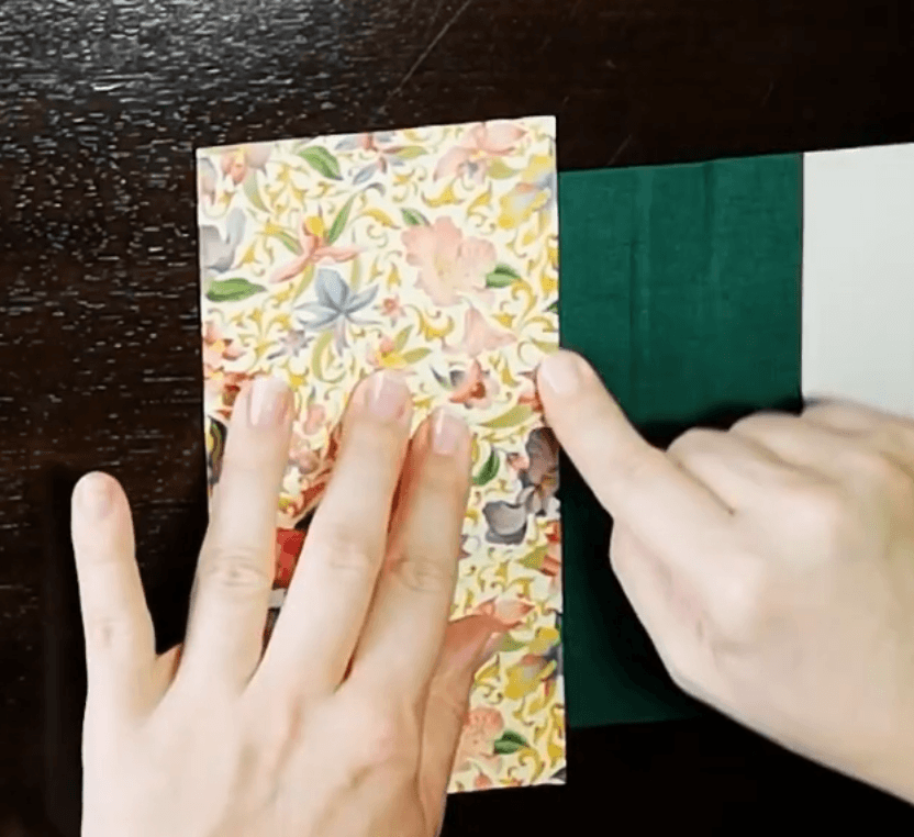 4 Leime die drei losen Kanten des Vorsatzpapiers ca. einen Finger breit rundherum ein, indem du das Papier in der Mitte festhältst und nach außen streichst.