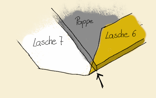 7 Wieder in den Leimbereich mit Buchbinderleinen nach unten legen. Jetzt werden die Laschen (3) eingeleimt. Beginne mit einer von ihnen.