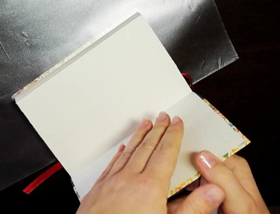 1 Unter beiden Buchdeckeln sollte Folie liegen. Diese verhindert das Festkleben des Papiers durch Leimrückstände und lässt keine Feuchtigkeit in den Buchblock, der sich sonst wellen könnte.