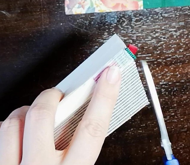 1 Trimme die Gaze an den vier Ecken in einem flachen Winkel. Schneide sie dazu einfach mit der Schere schräg an bis zum Kapitalbändchen.